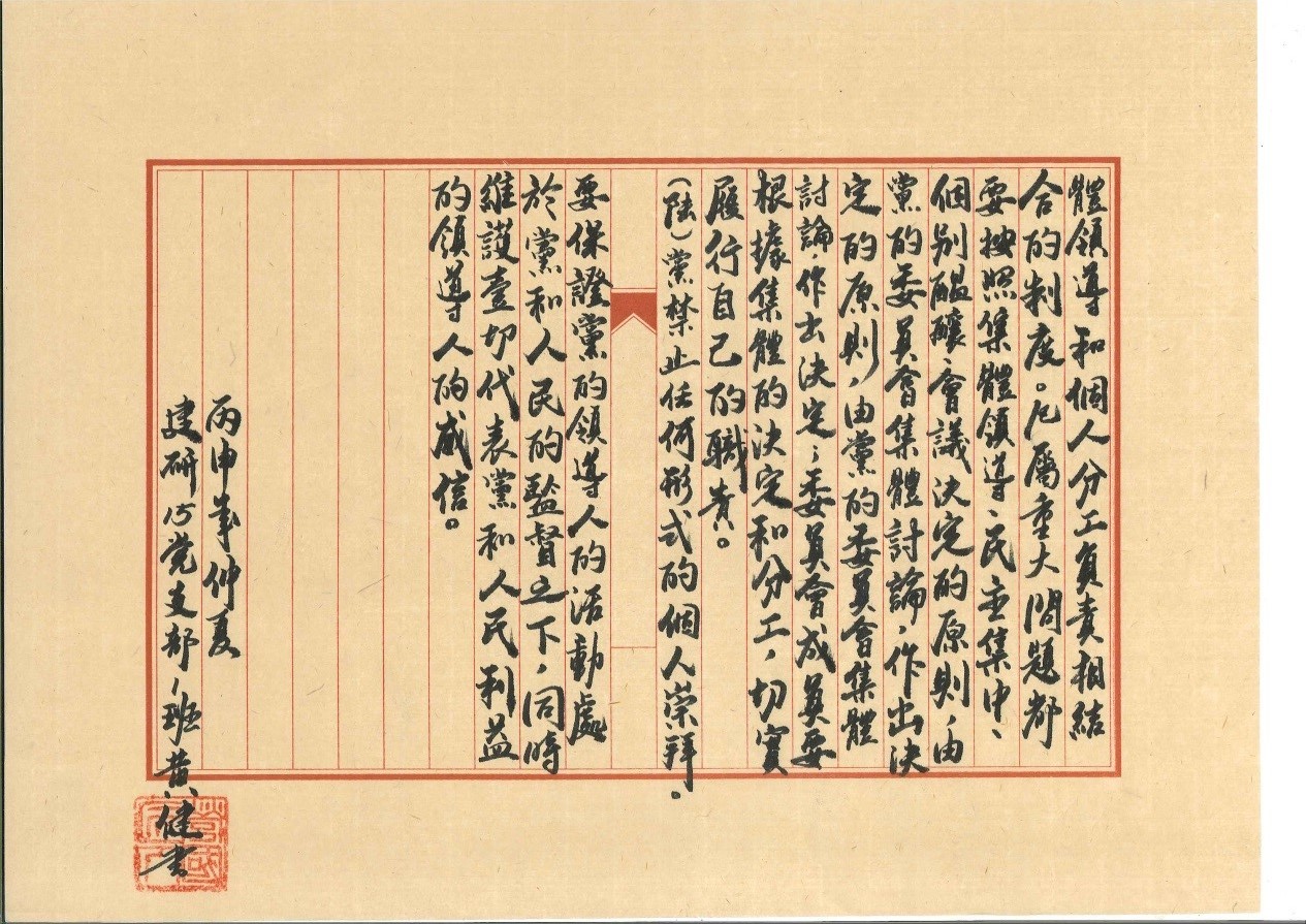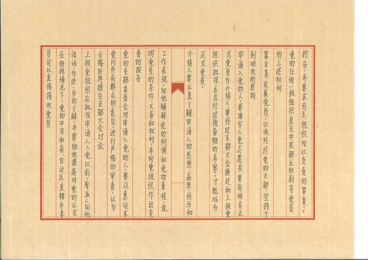建筑公司党员理论学习与实践活动,一贯秉承将专业特色融入党建活动中的思路,让员工党员以专业为带动,调动员工党员参加组织生活的积极性,激发广大党员同学学理论、用理论的热情,本次党章学习活动主要以员工党员抄写党章的形式展开,以员工党支部为单位,协调各支部党员人数,每名员工党员进行600字左右的党章抄写,形式以专业学习中的工程字、软笔字为主。该项活动历时三周,员工党员挑选出较为整齐美观的手抄党章,在支部内进行交流学习,并最终挑选部分作品装订成册,在公司内进行交流展示。