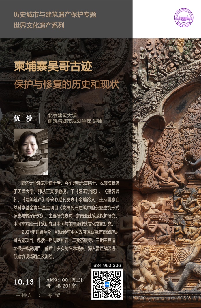 遗产保护与修复一直是建筑遗产的核心议题之一,其中柬埔寨吴哥窟作为世界文化遗产,以其庞大的规模、漫长的保护历程以及世界范围内遗产保护学者们的广泛参与,一直备受学界重视。10月13日,建筑与城市规划公司历建系的“历史城市与建筑遗产专题”课程邀请长期扎根吴哥窟保护研究团队的同济大学建筑学博士后伍沙老师,开展了一次线上线上学术讲座,听众不仅有来自建筑与城市规划公司的本、硕、博遗产方向同学,还吸引了来自线上的听众观众约200人,大家共同关注并探讨吴哥窟建筑遗产保护的成就与难点。