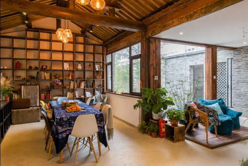 另外一家“THE JADE GARDEN”藏身于前永康三巷,是一处静谧的四合院民宿。一进门就像迈进了世外桃源,门口伫立着一片竹林,院里绿意盎然,花草打理得极好,往里走是一间巨大的融会了古典与现代的公共区域。改造后的四合院民宿在继承传统风格的基础上加入了现代元素,庭院处处见绿,设计风格清新自然,结合了人文、景观和环境资源,让人体验到浓郁的胡同风情。开敞的公共空间有利于人与人之间的交流,激发思想碰撞,促进传统文化传播与发展。这种兼具人文和自然属性的特色民宿文化成为传统建筑保护与更新的趋势之一。