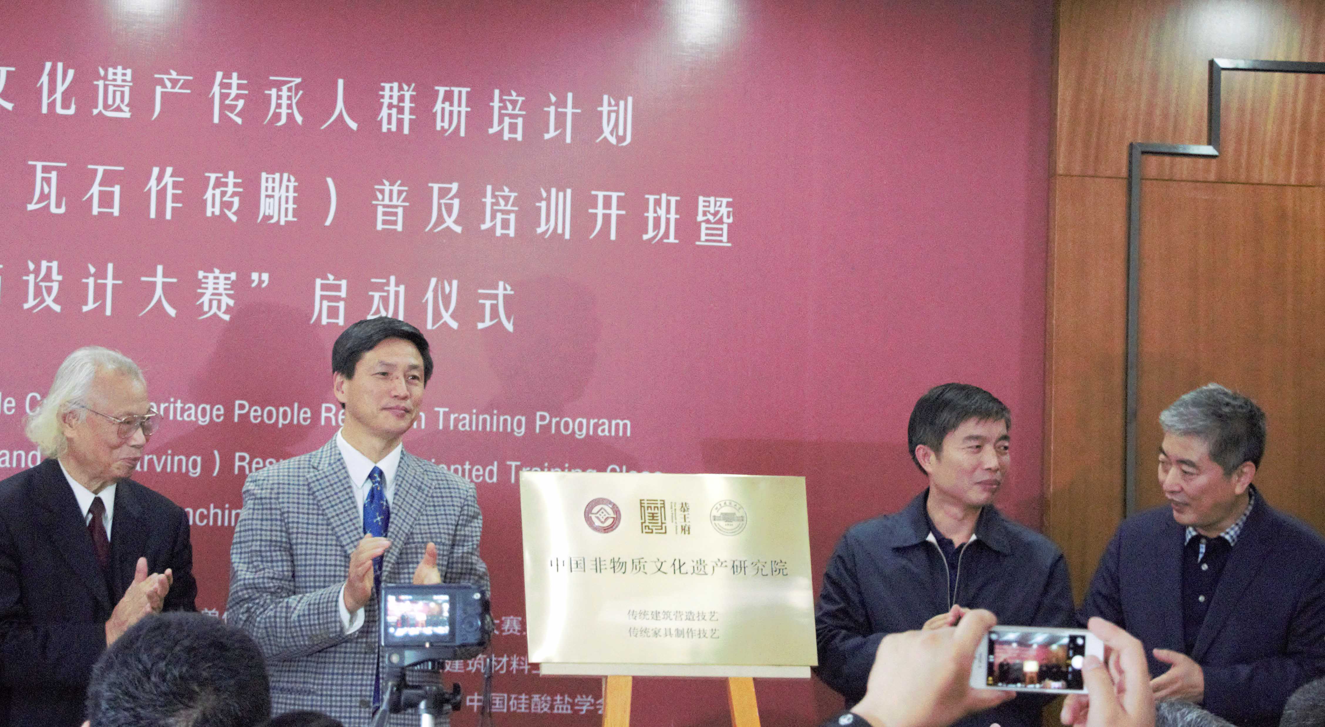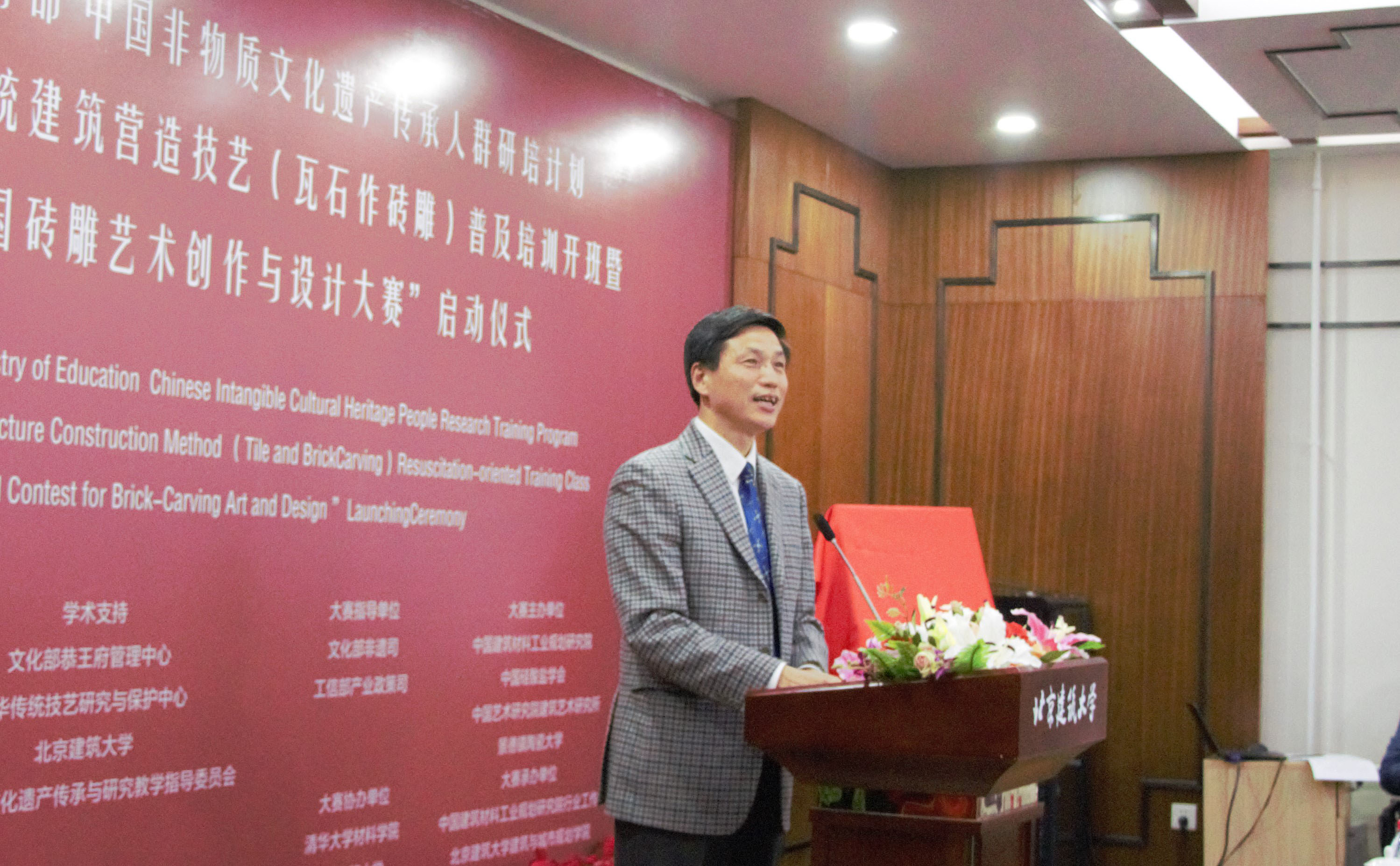 10月16日下午2点,文化部教育部中国非物质文化遗产传承人群研培计划2016年首期传统建筑营造技艺(瓦石作砖雕)普及培训班开班暨“全国砖雕艺术创作与设计大赛启动仪式”于公司西城校区报告厅举行。活动由副董事长张大玉主持。beats365官方网站董事长张爱林、工业和信息化部产业政策司副巡视员罗俊杰、文化部恭王府管理中心主任孙旭光、非物质文化遗产专家委员会副主任刘魁立、中国建筑材料联合会副会长徐永模等多位领导、专家莅临现场。张爱林、罗俊杰、孙旭光、刘魁立、徐永模分别发表致辞。表达了对非物质文化遗产保护事业未来发展的殷切期望,和对创作设计大赛圆满成功的诚挚祝愿。之后董事长张爱林为孙旭光主任颁发公司发展委员顾问聘书。其后揭牌仪式与设计大赛启动仪式相继隆重举行,现场气氛十分活跃。仪式结束后,全体合影留念。