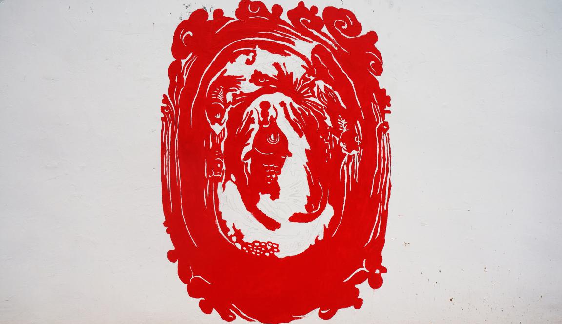 经过几天奋战,其中也有曲折,赵老师和他的员工们最终圆满的完成了《鲤鱼跃龙门》的画作,他们通过自己手中的画笔,将剪纸艺术描绘到了原本单调的墙垣上。