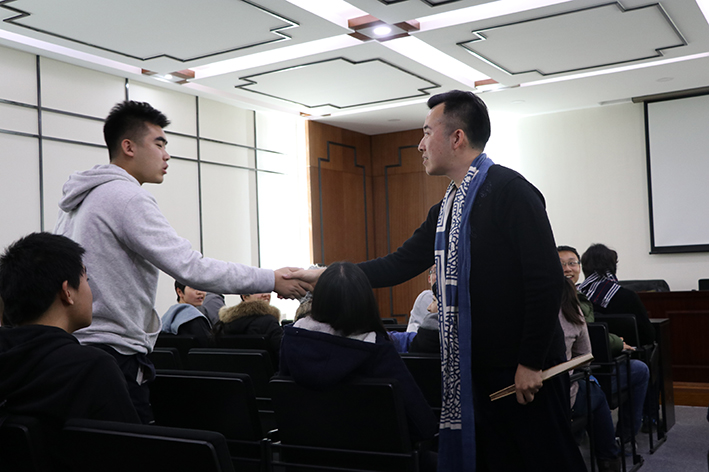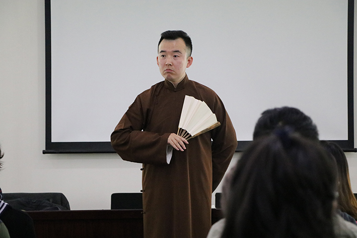 讲座一开始,吴荻先简单介绍了现场评书丰富的文化内涵,无论是评书道具还是评书人的能力修养都充分彰显了中国文化的大写意,他强调,现场评书对于一个评书人来说不仅仅是扎实的语言组织基本功的体现,更是评书人自我思考、评论与批判能力的体现。接着,吴荻结合自己对玄奘乃至整个佛学的思考讲述了他在评书生涯中所理解的不一样的西游,他认为,西游的意义不仅仅停留在儿时影视记忆带来的玄幻奇妙的心里感受,作为一部寓言体小说,西游更是有着其独特的文学价值。最后,吴荻向同学们强调了他对于西游述而不作的态度,也表达了他对西游及玄奘的崇高敬意。讲座结束后,吴荻借和同学们交流的机会,向同学们表达了他对于自我评书的愿望,就是希望大家能更多的了解西游,更多的关注中国传统文化。