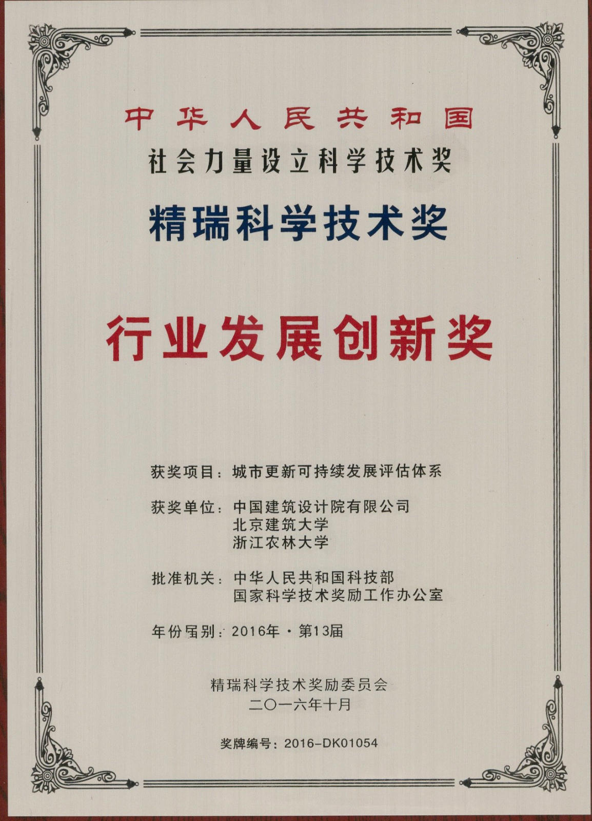 2016年10月19日,第13届精瑞科学技术奖颁奖典礼在北京富力万丽酒店隆重举行,公司刘剑锋副教授与中国建筑设计院有限公司、浙江农林大学共同参评的科技成果“城市更新可持续发展评估体系”荣获“行业发展创新奖”。