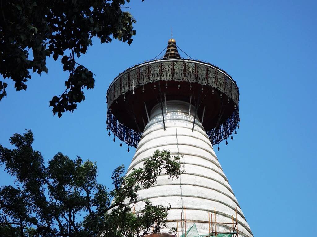 七佛宝殿后为塔院,即第四进院。塔院门一间,为无梁殿形式,歇山顶,筒瓦屋面,檐下悬挂匾额一方,上书“敕建释迦舍利灵通宝塔”。门后为具六神通殿,面阔三间,进深七檩,歇山顶,筒瓦屋面,檐下施以斗拱,额枋绘金线大点金旋子彩画。明间装修为五抹三交六碗槁扇门四扇,外带帘架,次间为三抹三交六碗槛窗,背立面有石砌佛龛一座。殿内供奉三世佛。白塔位于具六神通殿后,高50.9米,整座塔由塔基、塔身、塔刹三部分组成,塔基平面为折角四方形须弥座;塔身为一圈莲花瓣承托着巨大的覆钵体,七条铁箍紧束;塔刹有上小下大的13层相轮,托着一直径为9.7米的铜制华盖,华盖周边悬挂着36片雕刻有佛字及佛教八宝的铜制华幔,每个华幔下各挂有一个风铃,塔刹顶为一铜镏金空心的覆钵式塔。塔院四角各有角亭一座。从这个角度看去,白搭没有了那种高大雄伟的感觉,红墙白塔翠柏,更多了几分江南园林的幽静之美。