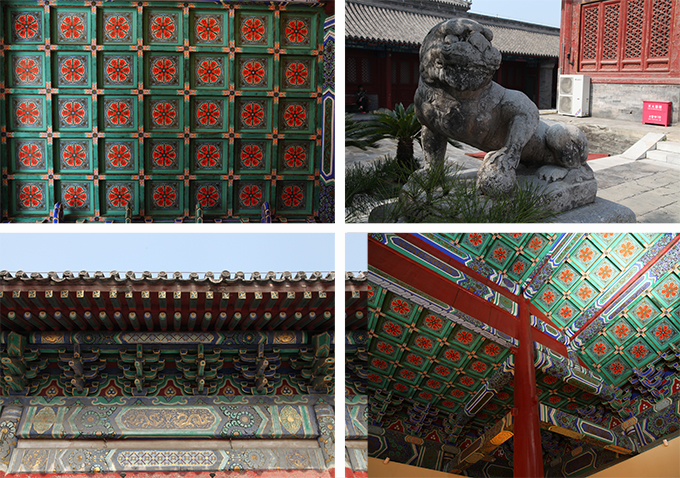 殿内的藻井和榫卯构件精美,充分显示出古代工匠的高超技艺,当心间与两边次间的天花中央均设计有盘龙藻井,精美绝伦,彩画部分为六字真言曼陀罗,当心间的梁部为墨线大点金旋子彩画,龙枋心、勾丝咬找头、西番莲盒子。