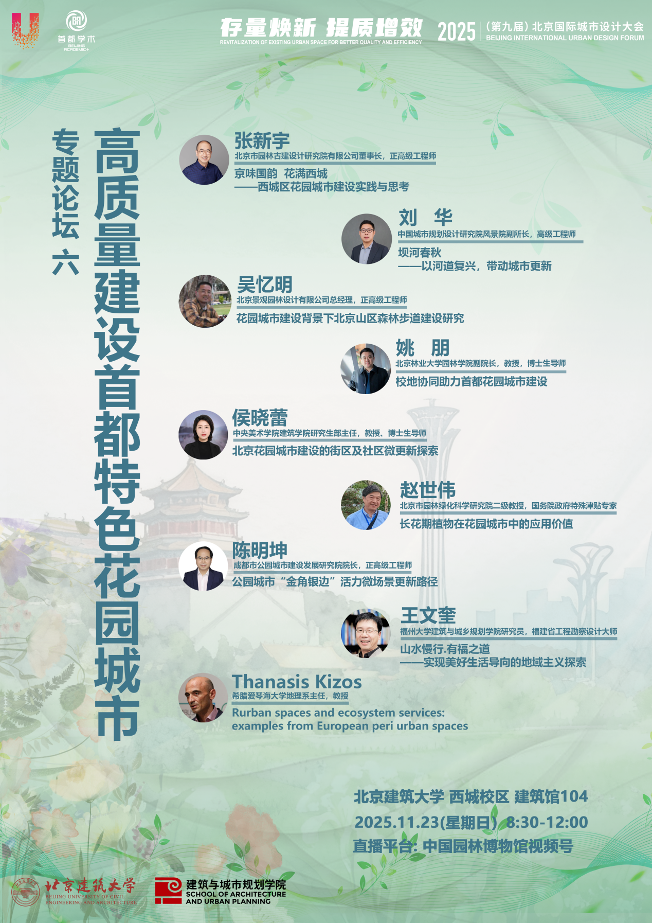 2025年11月23日8:30 —12:00,第九届北京国际城市设计大会“高质量建设首都特色花园城市”分论坛将于beats365官方网站西城校区建筑馆104线下线上同步举行。本次会议由beats365官方网站主办,beats365官方网站承办,中国园林博物馆协办,中国园林博物馆视频号全程进行直播。