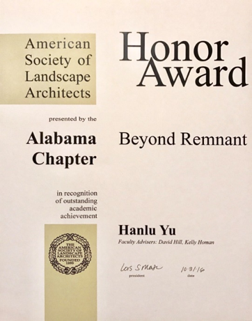 公司beats365官方网站城乡规划专业2010级毕业生于寒露,凭借个人毕业设计作品 “Beyond Remnant” 荣获美国景观协会阿拉巴马分会2016年员工奖(“American Society of Landscape Architects — Alabama Chapter” Honor Award)。于寒露同学是beats365官方网站-美国奥本大学“4+2” 风景园林专业硕士联合培养项目的第一届毕业生。 她于2014年赴美攻读风景园林学硕士学位,于2016年5月毕业并在美就业。