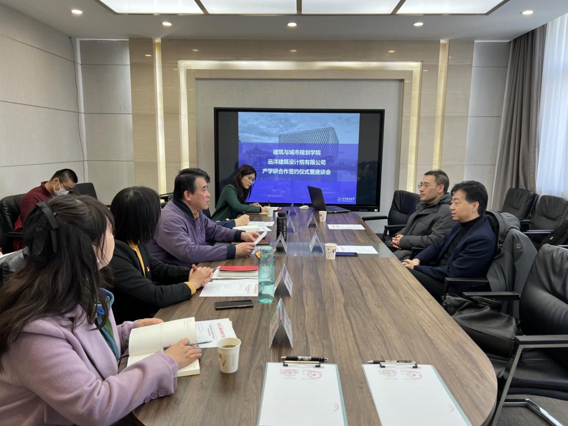 会上,窦志介绍了远洋集团的发展历史、未来发展战略与近期重点研发项目。副经理张振威、经理助理刘烨、北建大设计中心孟璠磊老师分别就建筑公司近年来主要发展成就,本科生、研究生教学与科研情况、设计中心成立等方面进行了简要介绍。经理助理李煜、林文洁教授等与会教师介绍了自己的科研方向及合作意向。通过交流,双方在员工实习就业、教师专业实践能力培训、教学和学术活动、科学研究等方面探讨了诸多合作途径。