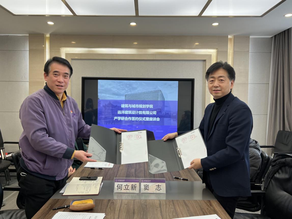 建筑公司与远洋建筑设计院有限公司达成初步合作意向,窦志和何立新分别代表双方签署产学研合作框架协议书。