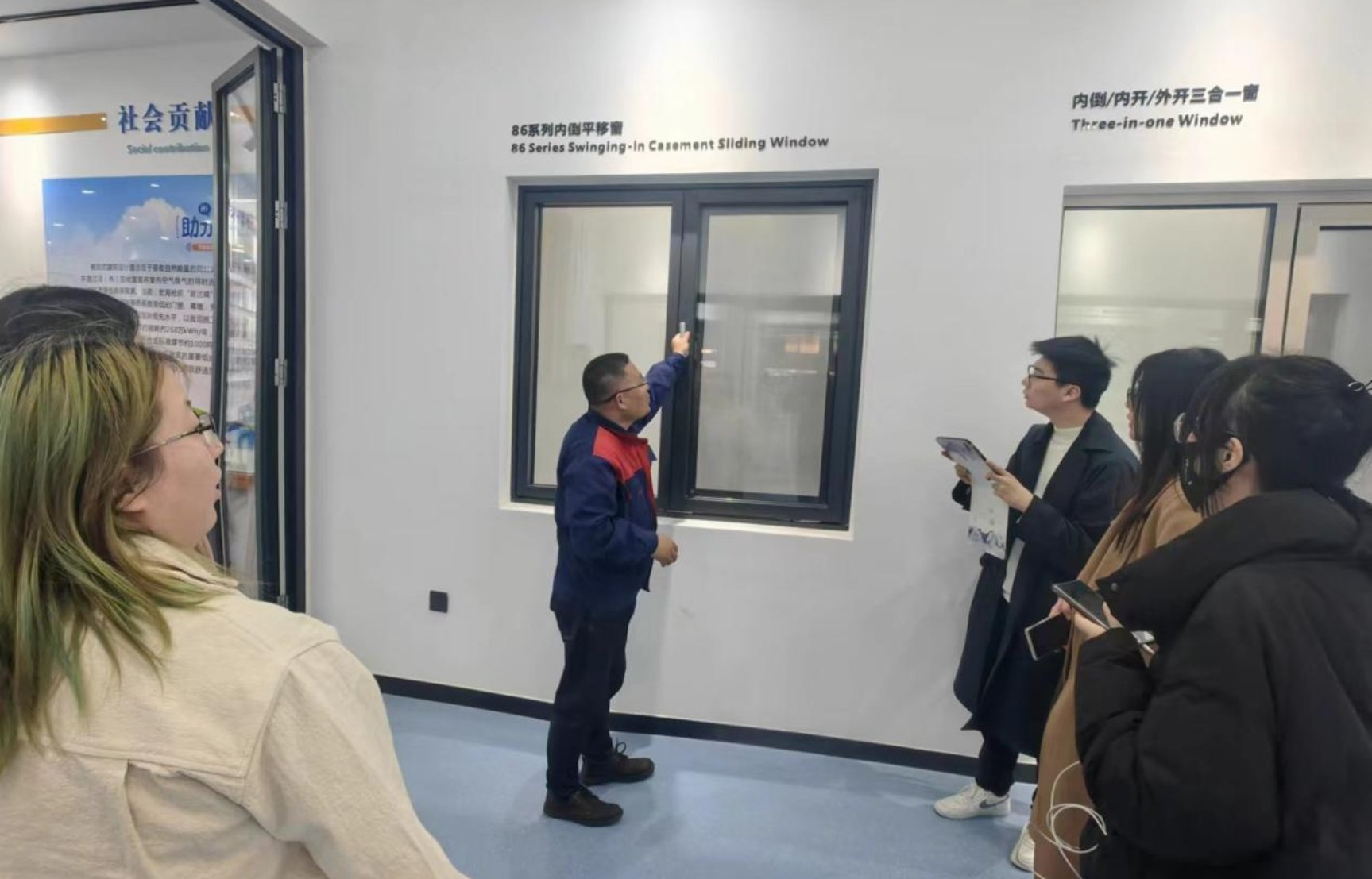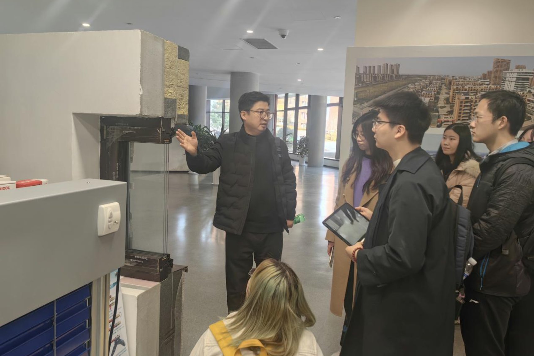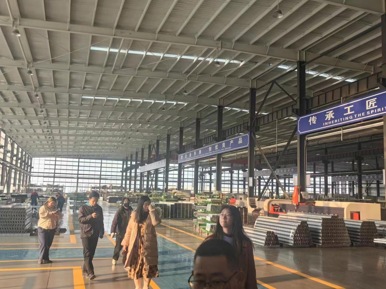 最后,同学们在鸿海幕墙企业负责人与技术总监带领下参观了近零能耗移动式建筑体验馆、门窗展厅、生产车间等,同学们深入了解了自动控制系统等新技术在门窗气密性、通风等方面的应用及实际生产流程,企业也初步拟定了与北建大绿建团队的校企合作意向。