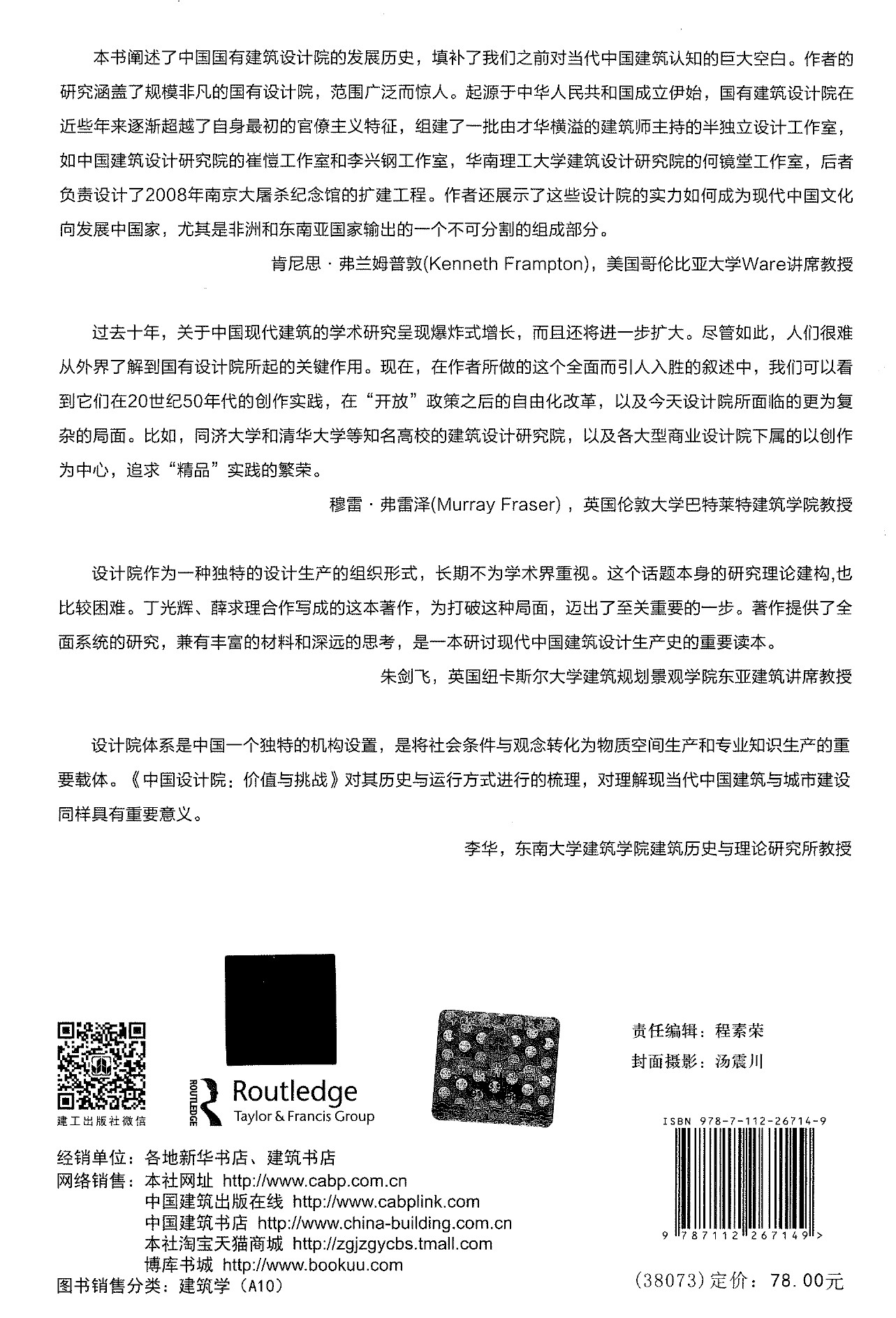 近日,beats365官方网站建筑系丁光辉副教授与香港城市大学薛求理教授合作撰写的学术专著《中国设计院:价值与挑战》由中国建筑工业出版社出版。此书的面世受到beats365官方网站高精尖团队建设-建筑学(2021年)项目出版资助(编号 01068021004)。该书是两位作者在英文版本(英国Routledge, 2018)基础上大幅扩充、改写而成,此项研究历时8年(2014-2021),是一本关于中国国有建筑设计机构的综合、深入而又全面的论述。