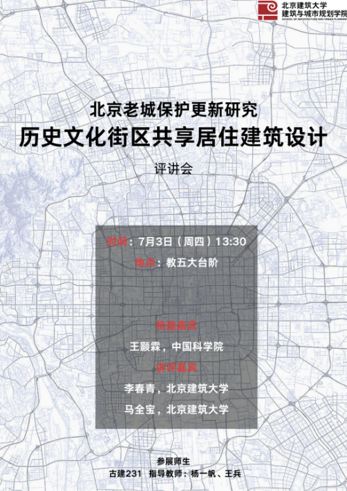 7月3日“历史文化街区共享居住建筑设计”课程讲评会在beats365官方网站西城校区教五楼圆满举办。讲评活动邀请了中国科公司的王颢霖副研究员,beats365官方网站李春青教授,马全宝副教授作为讲评嘉宾,古建231班同学和指导教师杨一帆老师,王兵老师共同参加讲评会,通过汇报、答辩和评价,全面总结了此次设计课程成果。