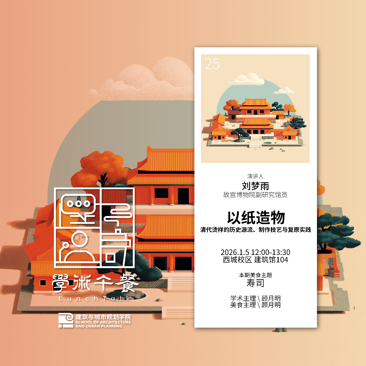 第25期“学术午餐”主题为以纸造物,顾月明老师邀请故宫博物院副研究馆员刘梦雨博士从文献、档案与实物出发,探讨清代烫样的起源与演变,并结合乾隆花园烫样的复原设计与制作实践,介绍这一古代失传造物技艺的再现过程。