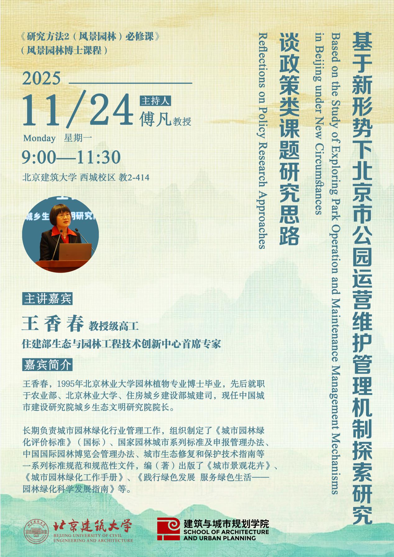 11月24日上午,公司特邀住房和城乡建设部生态与园林工程技术创新中心首席专家、中国城市建设研究院有限公司顾问总工王香春做政策类研究学术报告。风景园林系傅凡、魏菲宇、李露、王瑞琦、张振威等教师参加此次学术活动。