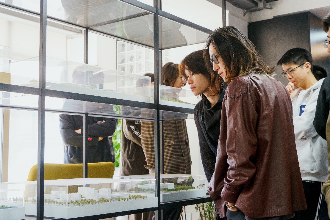 此次行程共分为两大部分。首先,在冯老师的带领下,李老师和同学们参观了教授工作室、公共办公空间、会议室、休闲空间等,对从一层到四层的整体办公环境有了大致了解。同学们欣赏着一件件精致的作品模型和墙上展出的落成项目照片,感慨着、憧憬着。