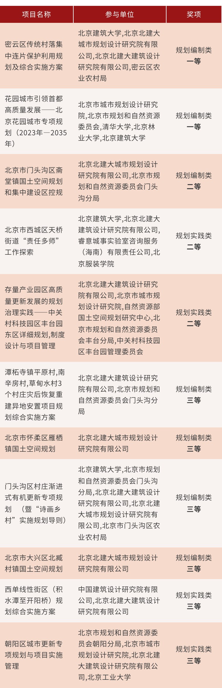 近日,北京城市规划学会公布了2025年度北京市优秀国土空间规划成果评荐结果。本届评荐共收到72家单位报送的344项参评项目。经专家评审、组委会审定,最终推荐一等成果30项,二等成果60项,三等成果90项,共计优秀成果180项。