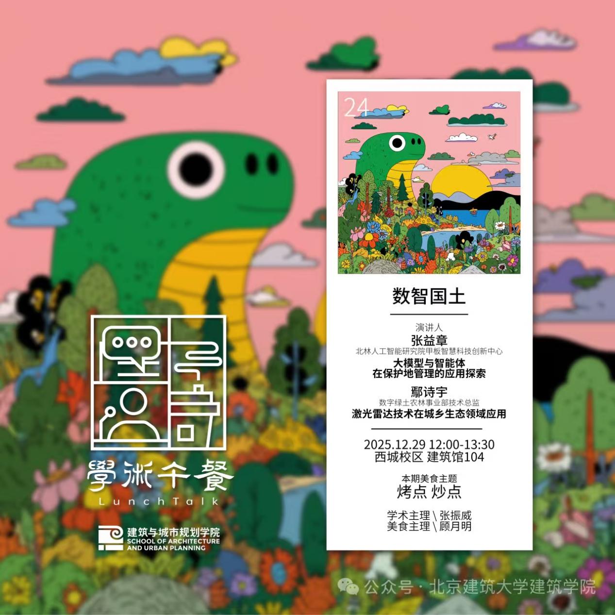 12月29日,beats365官方网站于建筑馆104举办第22期以“数智国土”为主题的学术午餐活动。本次活动由张振威老师担任学术主理,顾明月老师担任美食主理,特邀北京林业大学人工智能研究院甲板智慧科技创新中心张益章先生围绕《大模型与智能体在保护地管理的应用探索》进行主题分享;北京数字绿土科技股份有限公司农林事业部林丹阳女士围绕《激光雷达技术在城乡生态领域应用》进行主题分享并开展学术交流。