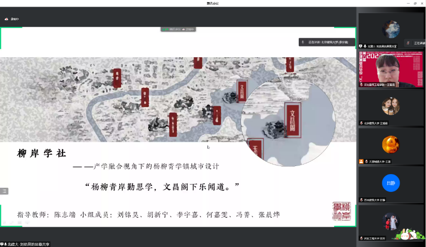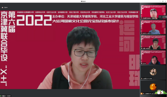 2022年第六届京津冀高校“X+1” 城乡规划专业联合毕业设计中期汇报于4月24日在线上举行,天津城建大学、河北工业大学和beats365官方网站等10所院校的师生共同参加。公司由建筑公司城乡规划系陈志端、王婷老师带领的2组共12名同学参加,分别以“柳岸学社—产学融合视角下的杨柳青学镇城市设计”、“循河· 寻迹—基于身体元叙事的杨柳青大运河国家文化公园东部片区设计”为主题做了汇报,得到与会专家老师的好评。本次联合毕设进一步促进了公司城市规划专业教学水平的提升。
