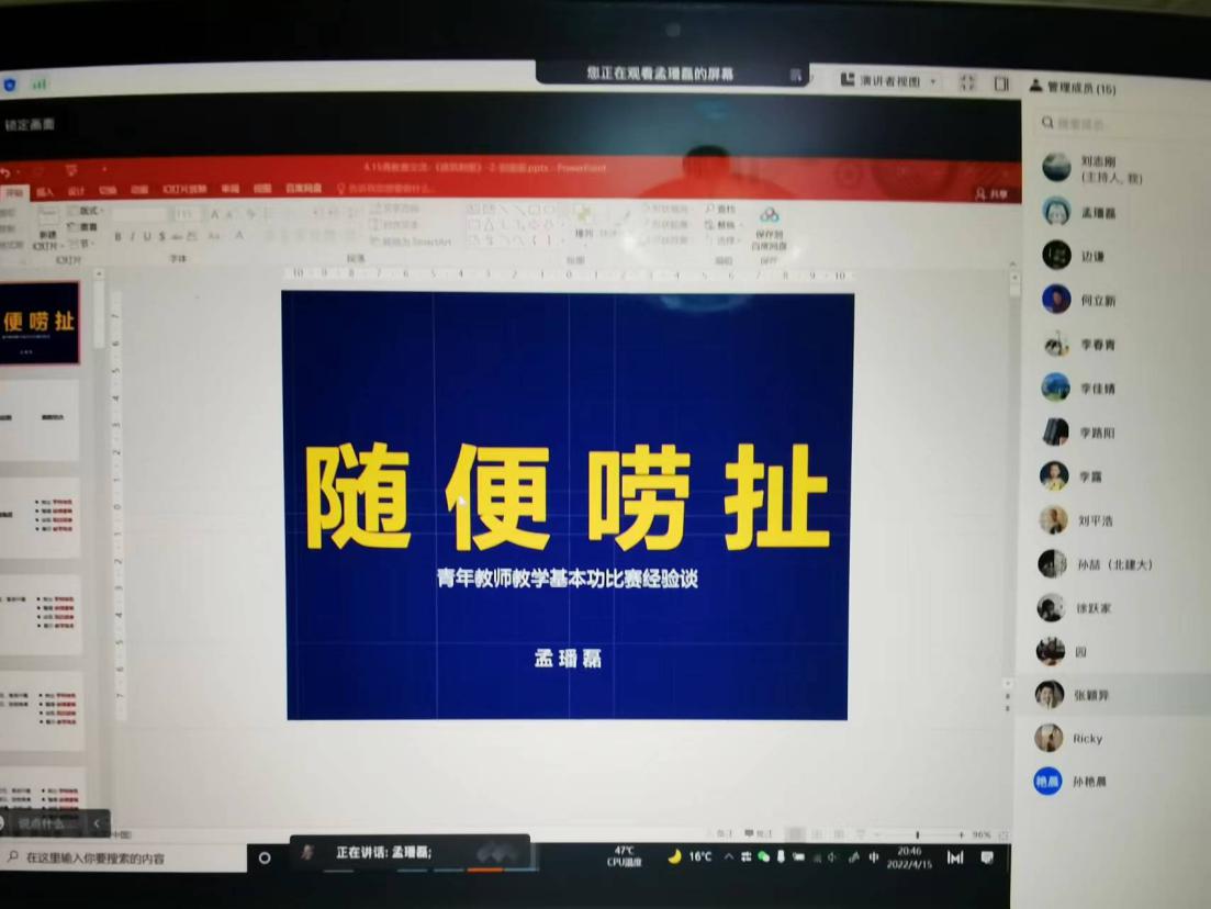 为了提高建筑公司青年教师的教学能力,建筑公司青年教师基本功比赛初赛结束后,公司于4月15日晚举办线上经验交流会,特别邀请第十三届北京市青年教师教学比赛一等奖获得者、建筑系孟璠磊副教授做了经验分享。建筑公司党委书记何立新、教学副经理李春青以及十多位青年教师参加了会议。