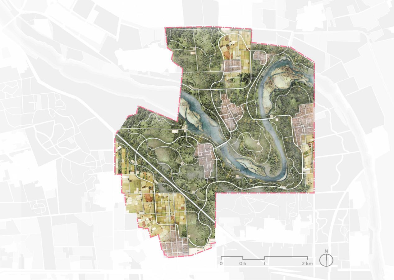 钟晴:这次的毕业设计中我遇到最大的困难是红线方面,在此之前我接触过的最大的题目是1km2,而这次的题目是12km2,同时还跨越了北京以及河北。第一次接触到这么大的题目在最开始的时候不知道如何应对。在规划层面以及前期分析方面都不知道从哪些方面进行展开。我们参考了上一次联合毕设的项目,因为同样是大尺度,去听了他们的汇报从而将场地设计提取归纳为了林水田村四要素。再分别从这四个角度,结合了现状的动物资源以及自然教育的主题进行了设计。