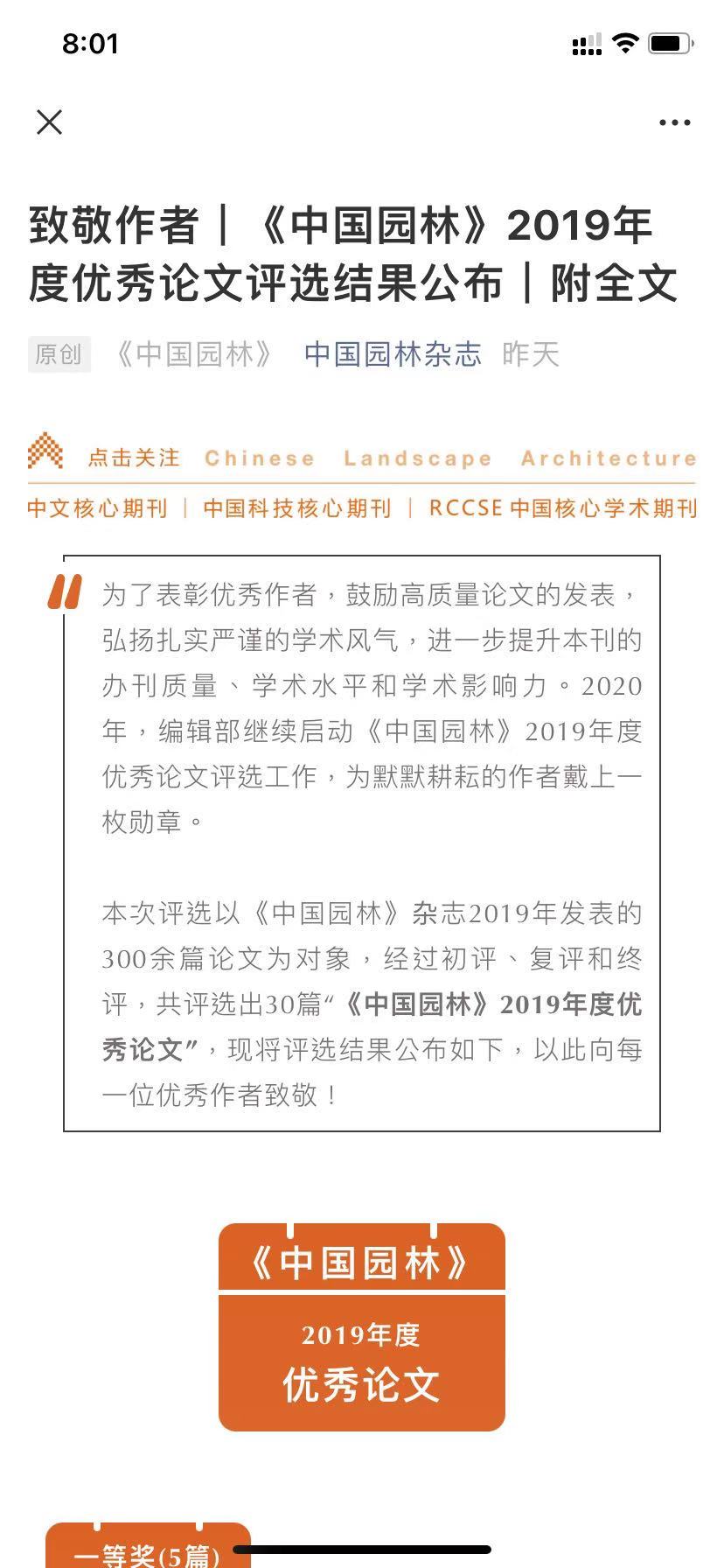 《中国园林》杂志属风景园林学科内公认的高级别中文核心期刊,收录于北大中文核心期刊目录,入选2020年建筑科学领域高质量科技期刊的T1级期刊目录。《中国园林》2019年度优秀论文评选工作的目的是表彰优秀作者,鼓励高质量论文的发表,弘扬扎实严谨的学术风气。此次评选以2019年发表的300余篇论文为对象,经过初评、复评和终评,共评选出30篇获奖论文。其中一等奖5篇,二等奖10篇,三等奖15篇。张振威作为第一作者发表的《土壤污染防治法背景下的城乡绿地系统建设:趋势与对策》被评选为“优秀论文三等奖”。