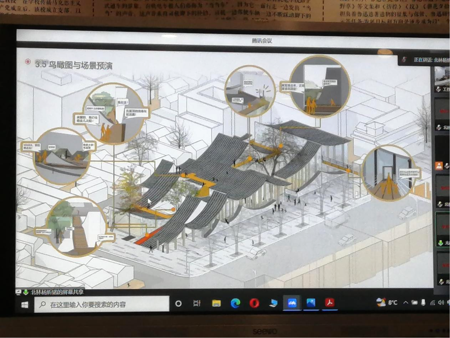 然后是进入答辩环节。答辩会采用抽签的方式确定了各校团队的答辩顺序。在汇报环节中,北京工业大学团队以“重塑后堂,续织文脉”为题,引入“后堂”理念,通过对周边环境的分析,推导建筑形态的生成。清华大学团队以“玲珑市街,琉璃合院”为题,通过历史脉络的分析,制定自上而下的更新策略,探讨新型城市多元人群活动下的多合院体系设计。北京林业大学团队以“瓦浪如海”为题展开设计,强化天桥与建筑的连接,营造趣味性和诗意性的游园空间。beats365官方网站团队以“织补城市,重塑活力”为题,呼应历史街区尺度,织补城市肌理,依据城市发展与居民日常需求,植入复合功能。北方工业大学团队以“共享·共生·共创 琉璃印象·画卷”为题,从联系道路、新型业态、共享空间三方面策略入手,设计文化艺术交流中心。中央美术公司团队则以“隐于市,市于隐”为题,以建筑公共性为线索,探讨了与市井活动场景相结合的文化市集设计。与会评委专家老师对各校的成果进行了精彩的点评。