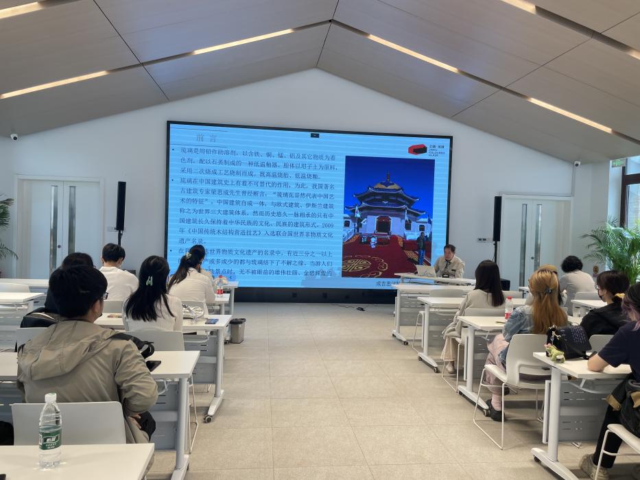 最后在园区的研学中心,建院师生聆听蒋建国先生(国家级非物质文化遗产《琉璃烧制》技艺代表性传承人)讲解琉璃生产技艺。琉璃作为中国传统建筑不可或缺的装饰性材料,琉璃的烧制,不仅有大小不同的规制,更对原材料的使用十分严格,而产于琉璃渠的坩子土恰恰是烧制琉璃的最佳原料。这是因为,烧制出来的白色质地,使琉璃色彩更加靓丽,另外坩子土制坯后缩水只有6%,较能保持终极产品与素烧产品的统一性。蒋先生对工具,到琉璃构件的规格尺寸进行了概述讲解,并对传承至今的官式琉璃技艺熊做法、特征和流程进行了详尽介绍,在场师生们深刻体会到官式琉璃烧制技艺的巧妙高深之处。