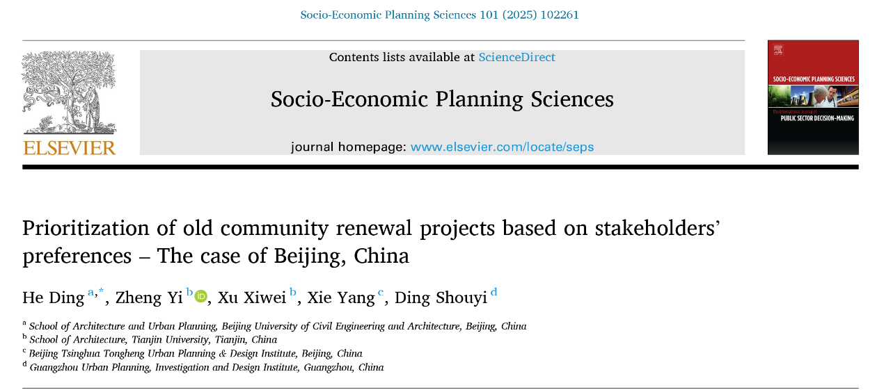 建筑公司历史建筑保护系贺鼎副教授与研究生郑毅等作者在社科领域Top期刊《Socio-Economic Planning Sciences》发表论文“Prioritization of old community renewal projects based on stakeholders' preferences – The case of Beijing, China”。该期刊是Elsevier旗下国际性的跨学科期刊,内容涉及公共政策、资源配置与可持续发展等前沿议题,是经济学研究领域的顶级期刊(SCI、SSCI Q1;中科院经济学一区TOP;影响因子5.4)。论文以beats365官方网站为第一署名单位,贺鼎副教授为第一作者,研究生郑毅为第二作者。该研究使用“偏好逻辑评分(LSP)模型”与情景模拟相结合,结果有助于规划师制定老旧小区更新规划方案,形成计算机辅助的城市更新决策系统。