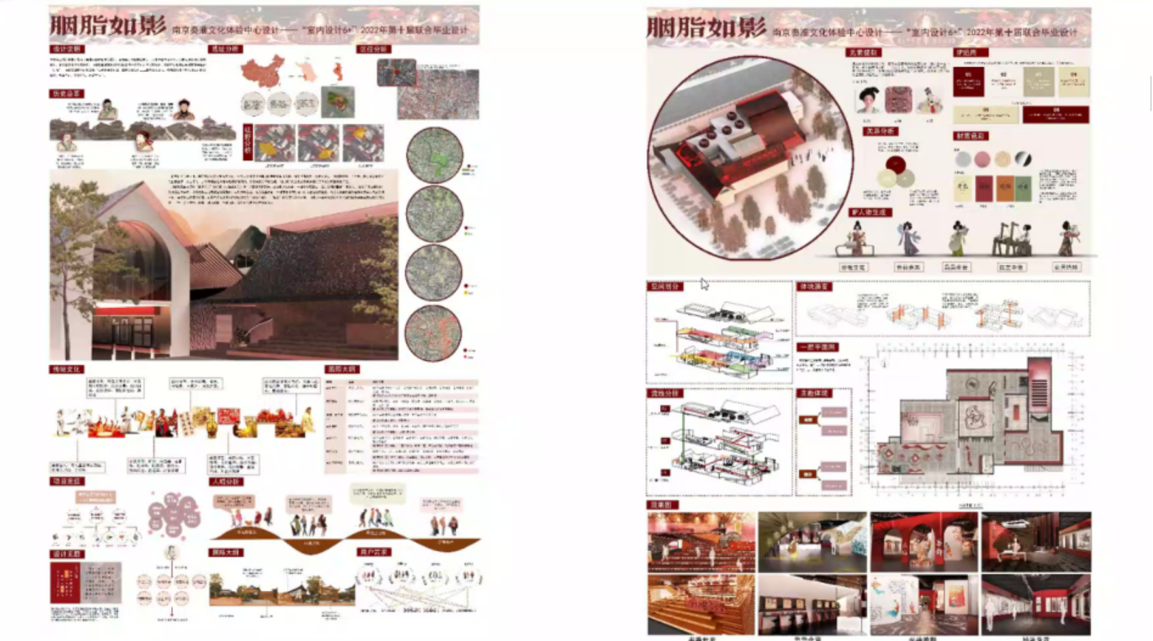 专家点评:设计思路较为清晰,胭脂的概念对于整个文化的提炼是非常有特质的。前期概念和研究体现完备,概念富有创意,成果集中紧凑。功能流线和创意表达可再清晰。