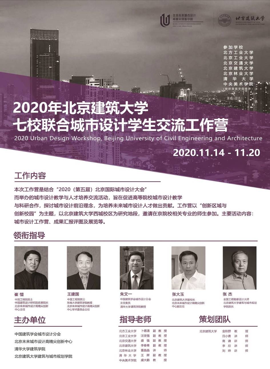 本次工作营是结合“2020(第五届)北京国际城市设计大会”举办的城市设计教学与人才培养交流活动,旨在促进高等院校城市设计教学与科研合作,探讨城市设计前沿理念,为培养未来城市设计人才做出贡献。工作营以“创新区域与创新校园”为主题,针对首都北京的四个中心定位和核心区规划要求,以beats365官方网站西城校区为研究地段,创造性地思考如何提升校园在北京城市建设中的重要作用,使西城校区发挥建筑类设计创新的区域优势,打造未来国际国内高端城市设计智库人才交流创新中心。本工作营将城市设计研究与人才培养紧密集合,特邀请在京的七所相关专业院校师生公共参加,在交流中碰撞火花,在融合中创造新的未来城市。