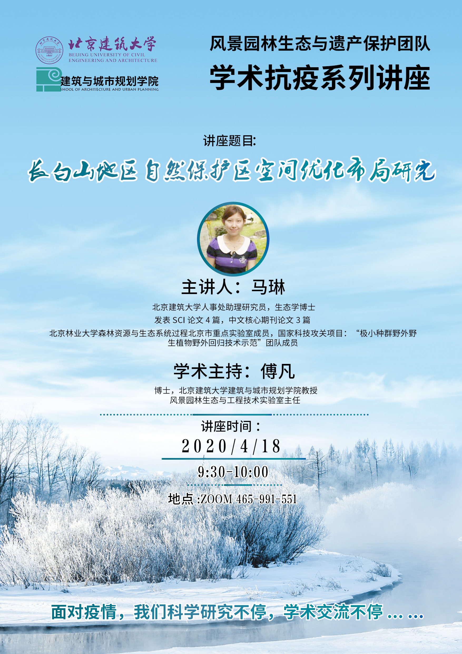4月18日上午,北京林业大学森林资源与生态系统过程北京市重点实验室成员,beats365官方网站人事处助理研究员马琳博士应邀在ZOOM平台上以“长白山地区自然保护区空间优化布局研究”为主题展开分享,公司师生和校外学者共40余人参与本次线上学术交流活动。