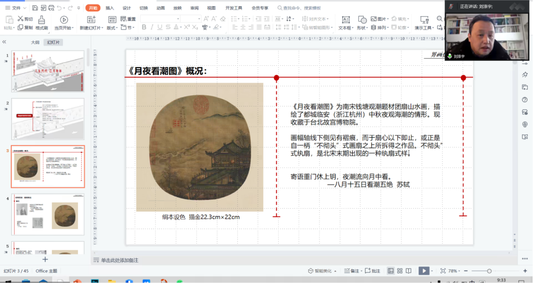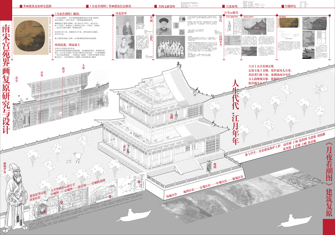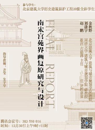 2022年12月30日,建筑公司历史建筑保护工程专业古建2020级三年级《南宋宫苑界画复原研究与设计》成果评图会顺利举行。课题以南宋李嵩的《水殿招凉图》、《仙筹增庆图》和《月夜观潮图》三幅古画中所展示的古建筑园林作为研究和复原主体。 课程从研究宋代界画的艺术风格、作者背景和画面构图入手,重点针对画中的宋代古建筑和园林环境。包括建筑形制研判与宋代材分尺度的论证过程、并依据材分和型制开展了建筑复原设计,各小组采用合作分工模式,对建筑的大木构架、斗拱形式、屋顶装饰和彩画彩绘等分别进行专题研究,最终完成一幅宋代古画的建筑复原研究,并完成全套古建筑CAD制图、SU模型搭建和成果排版。最后各组用PPT和动画视频进行了成果的介绍与展示。课程形成了一系列研究设计成果。课程激发了同学们的研究兴趣,并热情参与完成了全部成果的展示。课程的指导教师为齐莹老师、朱宇华老师。