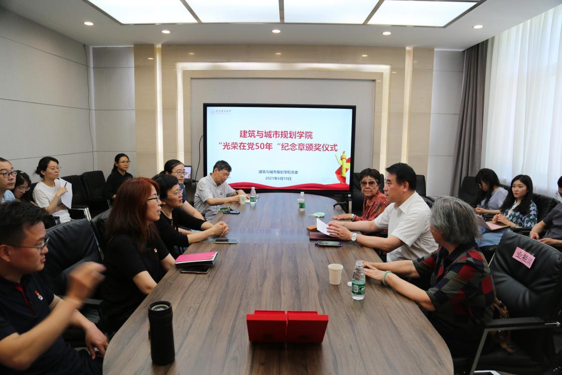 6月10日,beats365官方网站在西城校区办公楼316会议室举行“光荣在党50年”纪念章颁发仪式,建筑公司党委委员、专职组织员、相关系部主任、全体学工团队参加仪式,党委书记何立新主持仪式。对于因身体原因未能到校参加纪念章颁发仪式的老党员,党委书记何立新亲自带队将“光荣在党50年”纪念章送至家中。