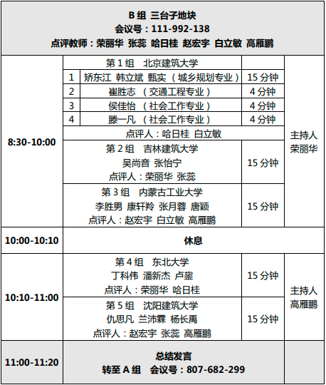 整个汇报按照和睦路地区和三台子地区两个规划地块分为A组(和睦路地块)与B组(三台子地块)同并时进行。10个规划设计小组围绕沈阳市大东区和睦路地块和皇姑区三台子地块的基本情况,从上位规划分析、地块现状分析、案例分析、规划策略和初步方案等维度进行15分钟汇报。各小组的规划方案均能综合运用大数据方法、文献法、社会调查方法(问卷法、访谈法)等多元研究方法,融入最新城市规划设计理念,切实把握规划地块的城市更新具体需求,呈现出各具特色的城市更新设计方案。
