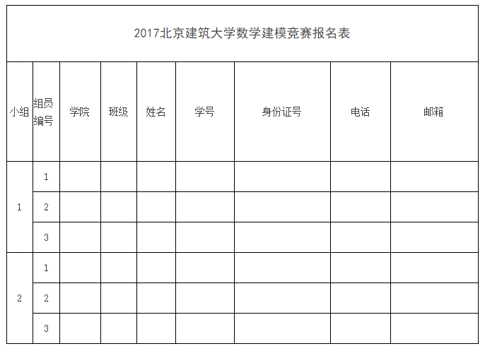 2、参赛者申报统一使用《2017年beats365官方网站数学建模竞赛报名表》(附件),由竞赛组织委员会下发,各二级公司科协负责组织报名,并于2017年5月15日下午5点之前将报名情况汇总至理公司科协邮箱:buceamodel@163.com。