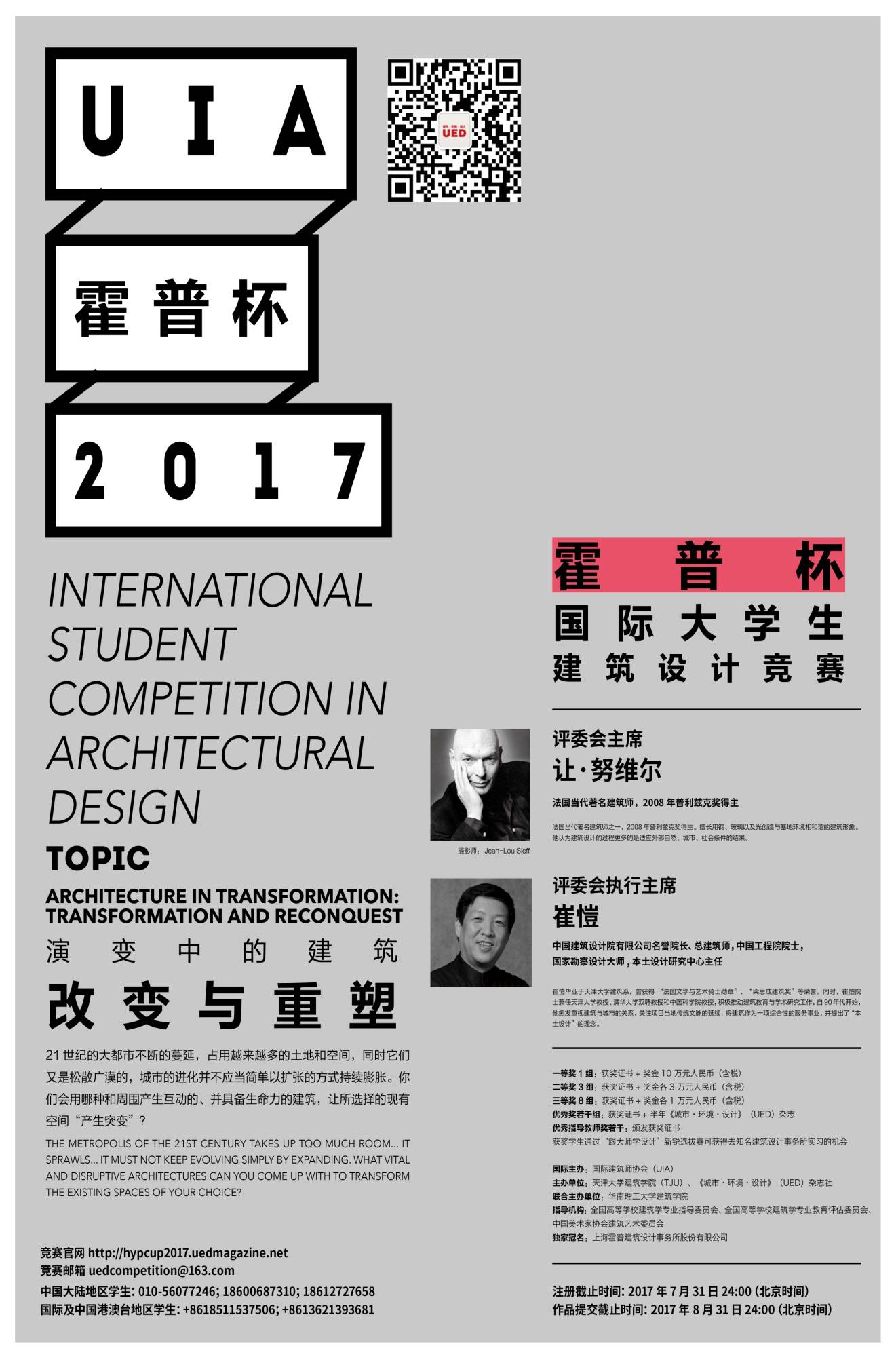 建筑进化的过程在于对现状问题的反思以及对所处时代的回应。建筑与城市、建筑与自然环境的关系问题一直是建筑师面临的课题。在支离破碎的城市、无序的乡村里寻找与构建具有场所感的人性化空间;在信息时代,体现与生态环境相协调的可持续发展的建筑理念;在建筑学教育体系中,将设计理念与扎实的建筑学功底有效地结合,是UIA-霍普杯国际大学?建筑设计竞赛秉承的主旨。竞赛要求参与者不断追问与探索建筑发展之路,探讨当代人对建筑与环境的复杂性需求,关注特定场所及其中的事件,构建具有生命?的城市与建筑空间,并寻求适宜技术使方案具有可实施性。 “UIA-霍普杯国际老员工建筑设计竞赛”始于2012年,由国际建筑师协会(UIA)任国际主办,天津大学建筑公司、《城市·环境·设计》(UED)杂志社任主办单位,是由霍普股份独家赞助的面向国际建筑高校老员工的年度建筑设计竞赛,已成功举办五届。2017年,竞赛将由华南理工大学建筑公司联合主办。每届竞赛的评委会主席由一名国际著名建筑大师担任,竞赛评委为来自国内外的著名建筑师及公司经理。经过五年的推行实践,这场由中国学术机构主办的国际老员工建筑设计竞赛已经成为最具影响力与公信力,规模最大的员工竞赛之一,在国内外建筑教育界具有广泛影响。