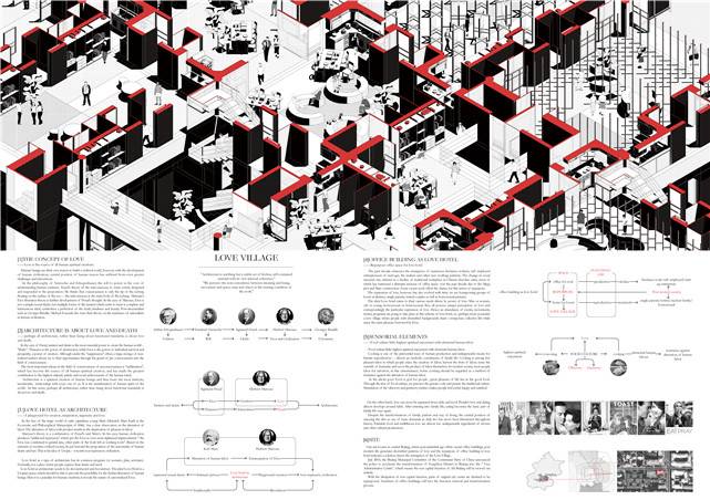 面对早期资本主义的悲惨世界,青年马克思对劳动异化的现象有着清晰地观察。他认为劳动本身与劳动产品之间所产生的分离与异化导致了劳动本身乐趣的丧失。 马尔库塞将弗洛伊德与马克思的理论结合起来。在他看来,人类文所产生的“额外的潜抑”将爱欲牢牢地禁锢了起来。“人们把爱欲集中到生殖区 , 身体的其他部分则留作劳动工具。”在批判现代文明的基础上,他提出了爱欲普遍化的主张。这是一种乌托邦式的理想——一种无潜抑的文明。 爱情公寓作为一种建筑类型有着自己固有程序(program)(或说是本身固有的情节剧本(scenarios),行为活动的设置)。通常,它是一个排遣欲望与需求的场所。 作为建筑的爱情公寓亟需解构并重构。理想中的爱情公寓应是一个乌托邦式的空间,能为人类的进一步解放提供可能。这将是一个人类创造力的乐园,是揭示尚未被普遍化的爱欲的场所。