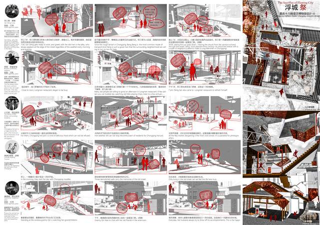 5.设计中将建筑碎片搭建为主要展示回忆空间,以祭奠消逝的老城;以不同历史时期典型活动场所为公共体验空间;以重庆典型的梯坎为原型做交通体系。