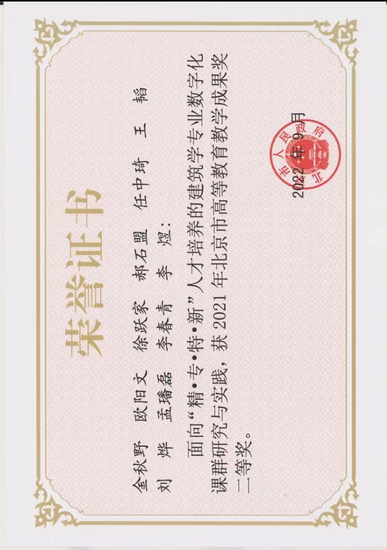 金秋野主持{面向“精.专.特.新”人才培养的建筑学专业数字化课群研究与实践}荣获二等奖。