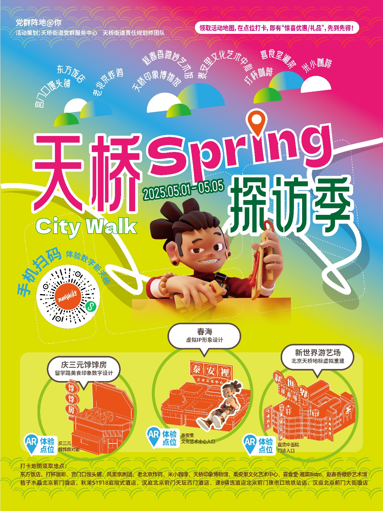 同步启动的“天桥Spring探访季”活动,包括“串门打卡”特色点位五一优惠活动和“天桥Citywalk剧本杀”沉浸体验两个部分。“五一”期间(5月1日-5月5日)领取特制探访地图打卡宫门口馒头、泰安里艺术中心等9处特色点位,可获得优惠或限量文创礼品,进一步激活遗产地消费与文化参与。